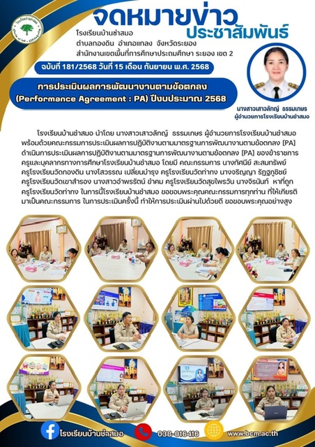 โรงเรียนบ้านชำสมอ นำโดย นางสาวเสาวลักญ์ ธรรมเกษร ผู้อำนวยการโรงเรียนบ้านชำสมอ พร้อมด้วยคณะกรรมการ ดำเนินการประเมินผลการปฏิบัติงานตามมาตรฐานการพัฒนางานตามข้อตกลง [PA] ของข้าราชการครูและบุคลากรทางการศึกษาโรงเรียนบ้านชำสมอ