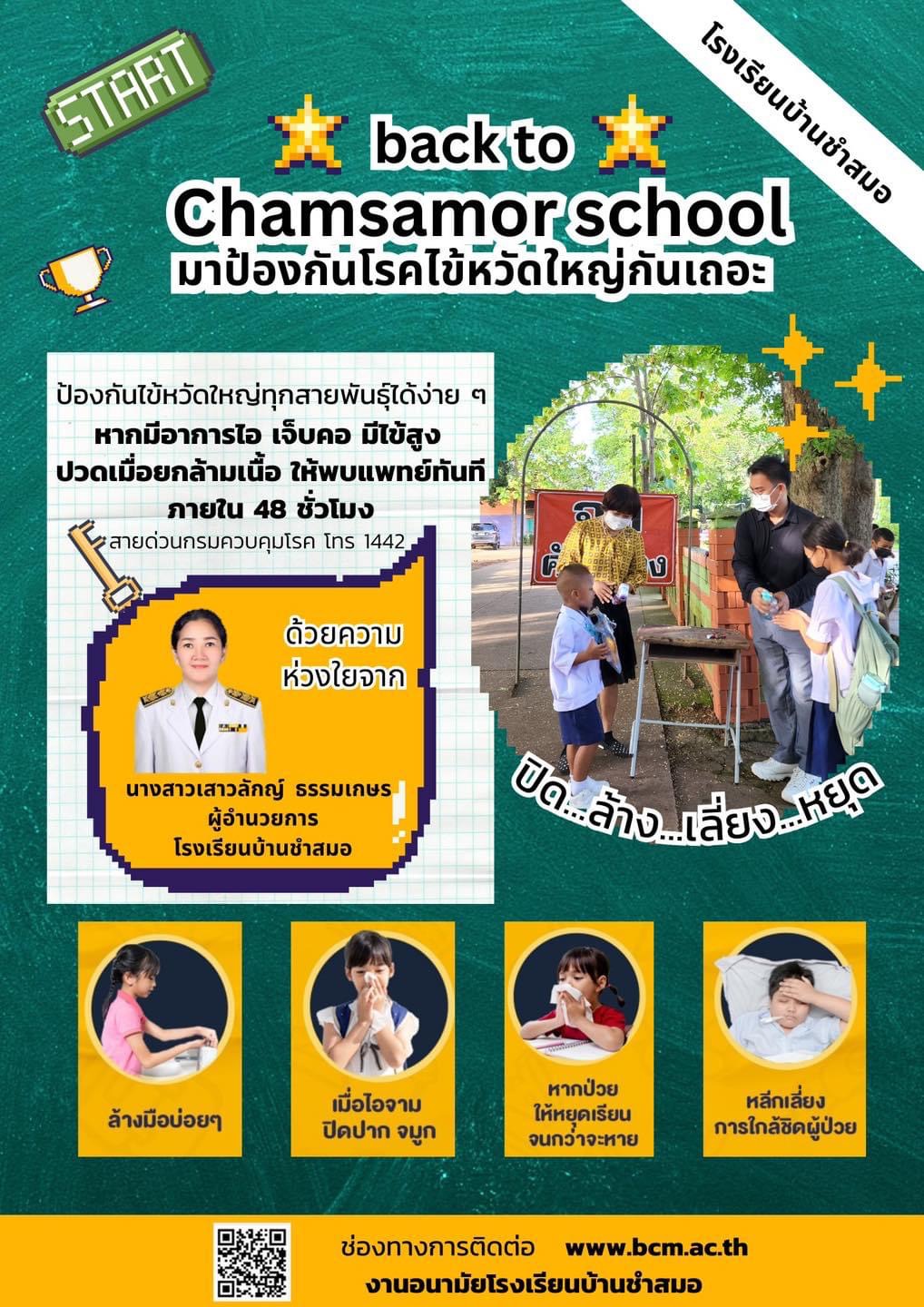 โรงเรียนบ้านชำสมอ จัดทำป้ายประชาสัมพันธ์ รณรงค์ การป้องกันไข้หวัดใหญ่ทุกสายพันธุ์ เพื่อป้องกันการติดเชื้อและแพร่เชื้อให้กับผู้อื่น