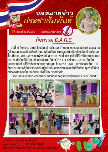 โรงเรียนบ้านชำสมอ นำโดย นางสาวเสาวลักญ์ ธรรมเกษร ผู้อำนวยการโรงเรียนบ้านชำสมอ พร้อมด้วยคณะครูและนักเรียนโรงเรียนบ้านชำสมอ ร่วมต้อนรับ พ.ต.อ.พิมุข นาคขำพันธ์ ผกก.สภ.ปากน้ำประแสร์ ที่ได้มาจัดกิจกรรมมอบประกาศนียบัตรให้กับนักเรียนชั้นประถมศึกษาปีที่ 5 และ 6 จำนวน 25 คน เนื่องในโอกาสที่นักเรียนได้สำเร็จการศึกษา หลักสูตร โครงการ D.A.R.E. แห่งประเทศไทย ที่มีวัตถุประสงค์ เพื่อให้นักเรียน เรียนรู้เกี่ยวกับยาเสพติดและภัยใกล้ตัวต่าง ๆ การใช้ชีวิตอย่างระมัดระวังในช่วงวัยรุ่น เพื่อให้มีอนาคตที่สดใส โรงเรียนบ้านชำสมอ ขอขอบคุณ สถานีตำรวจภูธรปากน้ำประแสร์มา ณ โอกาสนี้ |