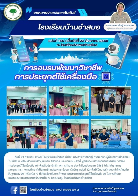 โรงเรียนบ้านชำสมอ นำโดย นางสาวเสาวลักญ์ ธรรมเกษร ผู้อำนวยการโรงเรียนบ้านชำสมอ พร้อมด้วยนางสาวนุชนารถ ศิลาแรง และนายมานะศักดิ์ พูลสนอง เข้าร่วมอบรมการพัฒนาอาชีพการประยุกต์ใช้เครื่องมือ AI เพื่อเพิ่มประสิทธิภาพการทำงาน ประจำปีงบประมาณ 2568