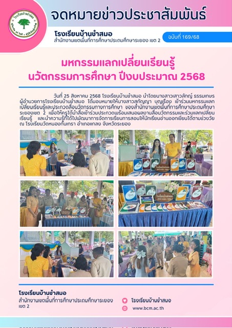โรงเรียนบ้านชำสมอ นำโดย นางสาวเสาวลักญ์ ธรรมเกษร ผู้อำนวยการโรงเรียนบ้านชำสมอ ได้มอบหมายให้นางสาวสุกัญญา บุญเรือง เข้าร่วมมหกรรมแลกเปลี่ยนเรี่ยนรู้และประกวดสื่อนวัตกรรมทางการศึกษา ของสำนักงานเขตพื้นที่การศึกษาประถมศึกษาระยองเขต 2