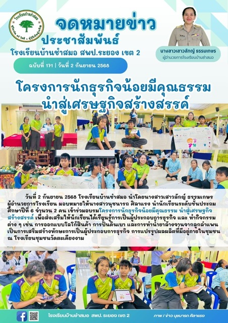 โรงเรียนบ้านชำสมอ นำโดย นางสาวเสาวลักญ์ ธรรมเกษร ผู้อำนวยการโรงเรียน มอบหมายให้นางสาวนุชนารถ ศิลาแรง นำนักเรียนระดับชั้นประถมศึกษาปีที่ 6 จำนวน 2 คน เข้าร่วมอบรมโครงการนักธุรกิจน้อยมีคุณธรรม นำสู่เศรษฐกิจสร้างสรรค์
