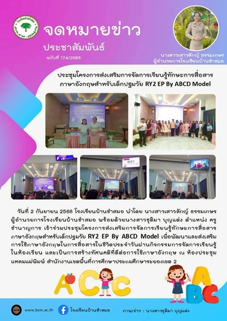 โรงเรียนบ้านชำสมอ นำโดย นางสาวเสาวลักญ์ ธรรมเกษร ผู้อำนวยการโรงเรียนบ้านชำสมอ พร้อมด้วยนางสาวชุติมา บุญแต่ง ตำแหน่ง ครูชำนาญการ เข้าร่วมประชุมโครงการส่งเสริมการจัดการเรียนรู้ทักษะการสื่อสารภาษาอังกฤษสำหรับเด็กปฐมวัย RY2 EP By ABCD Model