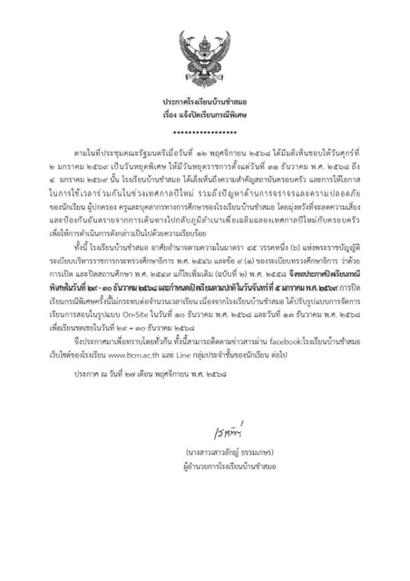 แจ้งปิดเรียนกรณีพิเศษช่วงเทศกาลปีใหม่