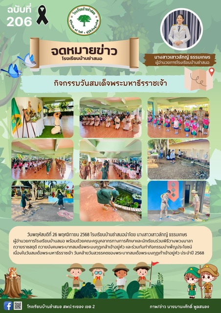 | โรงเรียนบ้านชำสมอ นำโดย นางสาวเสาวลักญ์ ธรรมเกษร ผู้อำนวยการโรงเรียนบ้านชำสมอ พร้อมด้วยคณะครูบุคลากรทางการศึกษาและนักเรียนร่วมพิธีวางพวงมาลา ถวายราชสดุดี ถวายบังคมพระบาทสมเด็จพระมงกุฏเกล้าเจ้าอยู่หัว และร่วมกันทำกิจกรรมบำเพ็ญประโยชน์ เนื่องในวันสมเด็จพระมหาธีรราชเจ้า วันคล้ายวันสวรรณคตของพระบาทสมเด็จพระมงกฎเก้าเจ้าอยู่หัว ประจำปี 2568 |