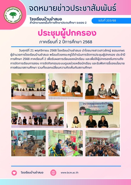 โรงเรียนบ้านชำสมอ นำโดย นางสาวเสาวลักญ์ ธรรมเกษร ผู้อำนวยการโรงเรียนบ้านชำสมอ พร้อมด้วยคณะครูได้ดำเนินการจัดการประชุมผู้ปกครอง ภาคเรียนที่ 2 ประจำปีการศึกษา 2568 เพื่อรับผลการเรียนของนักเรียน และเพื่อให้ผู้ปกครองรับทราบถึงการจัดการเรียนการสอน การจัดกิจกรรมระบบดูแลช่วยเหลือนักเรียน และรับฟังการชี้แจงนโยบายการพัฒนาสถานศึกษา รวมทั้งแลกเปลี่ยนความคิดเห็นกับสถานศึกษาการประชุมผู้ปกครองนักเรียน ภาคเรียนที่ 2 ปีการศึกษา 2568 |
