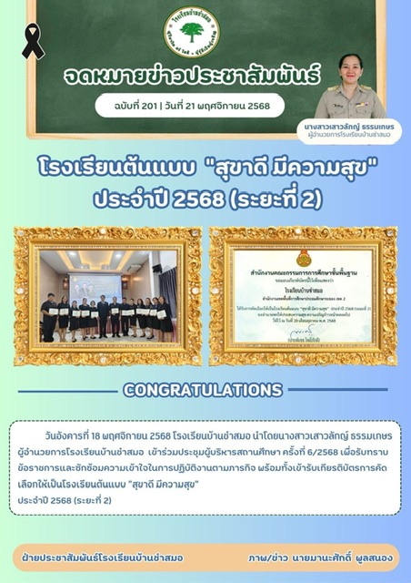 โรงเรียนบ้านชำสมอ นำโดย นางสาวเสาวลักญ์ ธรรมเกษร ผู้อำนวยการโรงเรียนบ้านชำสมอ เข้าร่วมประชุมผู้บริหารสถานศึกษา ครั้งที่ 6/2568 พร้อมทั้งเข้ารับเกียรติบัตรการคัดเลือกให้เป็นโรงเรียนต้นแบบ "สุขาดี มีความสุข" ประจำปี 2568 (ระยะที่ 2)