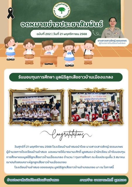 | โรงเรียนบ้านชำสมอ นำโดย นางสาวเสาวลักญ์ ธรรมเกษร ผู้อำนวยการโรงเรียนบ้านชำสมอ มอบหมายให้นายมานะศักดิ์ พูลสนอง นำนักเรียน เข้ารับมอบทุนการศึกษาของมูลนิธิลูกเสือชาวบ้านเมืองแกลง จำนวน 1 ทุนการศึกษา ณ ห้องประชุมชั้น 3 สมาคมฌาปนกิจสงเคราะห์ลูกลูกเสือชาวบ้านเมืองแกลง โรงเรียนบ้านชำสมอ ขอขอบคุณ มูลนิธิลูกเสือชาวบ้านอำเภอแกลง มา ณ โอกาสนี้ |