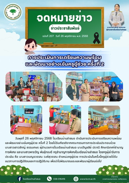 โรงเรียน บ้านชำสมอ ดำเนินการประเมินการเตรียมความพร้อมและพัฒนาอย่างเข้มครูผู้ช่วย ครั้งที่ 2 โดยได้รับเกียรติจากคณะกรรมการการประเมินประกอบด้วยนางสาวเสาวลักญ์ ธรรมเกษร ผู้อำนวยการโรงเรียนบ้านชำสมอ นางปัญชลีย์ ปราณี ศึกษานิเทศก์ชำนาญการพิเศษ และนางสาวพาขวัญ